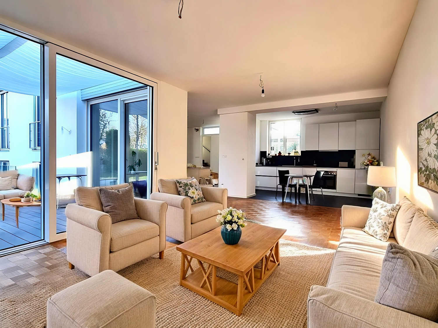 Der großzügige Wohnbereich - mit einer Raumhöhe von 2,70 m - zeichnet sich durch seine offene Raumgestaltung aus und wird durch bodentiefe Fenster erhellt, die nicht nur für viel Tageslicht sorgen, sondern auch einen herrlichen Blick auf den liebevoll angelegten Garten bieten. Hier finden Sie ausreichend Platz, um zu entspannen und den Tag zu genießen. Direkt angrenzend befindet sich die hochwertige Einbauküche, die mit modernen Geräten und edlen Materialien ausgestattet ist.
