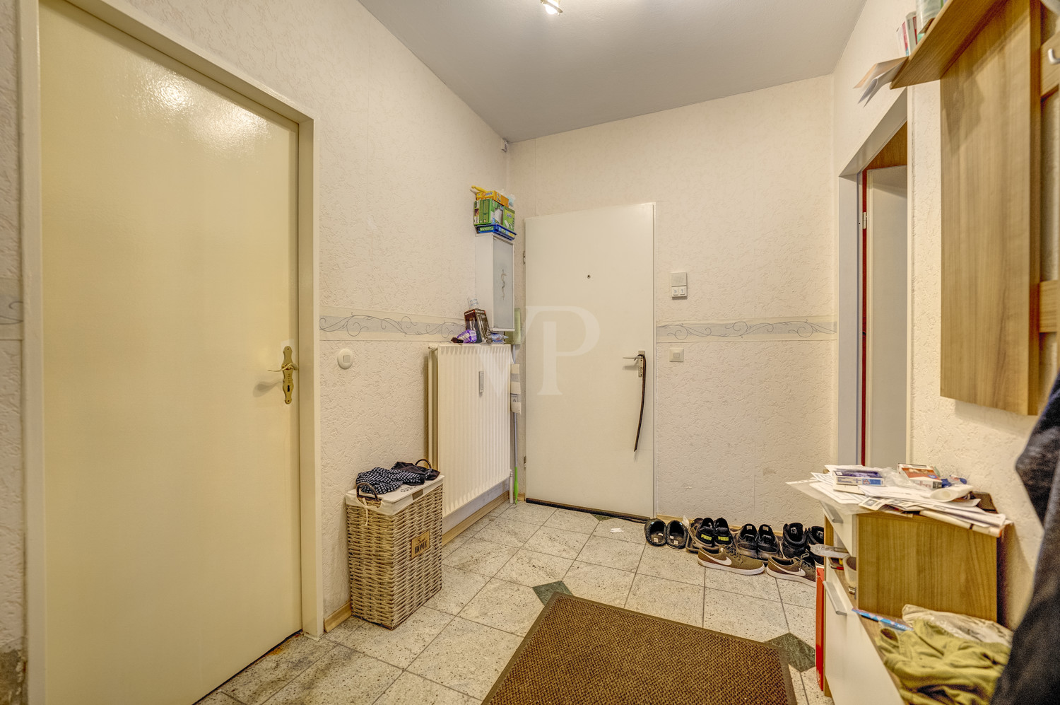 Das Badezimmer verfügt über eine Duschwanne und bietet eine funktionale Ausstattung. Die gefliesten Bereiche in Bad, Küche und Flur sind robust und pflegeleicht, könnten jedoch im Zuge einer Modernisierung an aktuelle Wohntrends angepasst werden. Die vorhandene Einbauküche ist in die Jahre gekommen und befindet sich in einem einfachen Zustand. Dies bietet Ihnen die Möglichkeit, Ihre persönliche Traumküche zu verwirklichen und die Räumlichkeiten nach eigenen Vorstellungen zu gestalten.