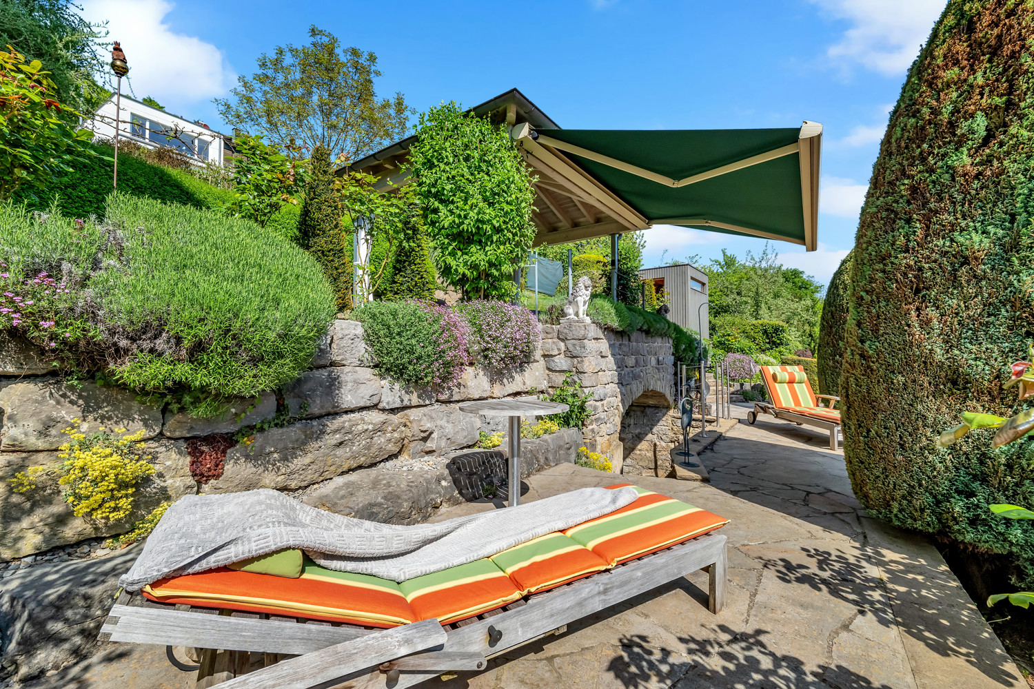 Auch im Außenbereich wurde an nichts gespart: Die modernisierten Gartenanlagen mit Gartenhaus, automatischer Bewässerungsanlage und Außendusche sind perfekt gepflegt und schaffen ein idyllisches Wohnumfeld. Umlaufende Balkon- und Terrassenflächen sowie ein erst kürzlich errichteter Freisitz sorgen für sonnige Plätze zu jeder Tageszeit.