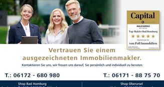 Mit unserem VON POLL IMMOBILIEN Shop in Bad Homburg stehen wir Ihnen jederzeit zur Verfügung und beraten Sie zuverlässig und kompetent bei der lokalen Immobilienvermittlung.