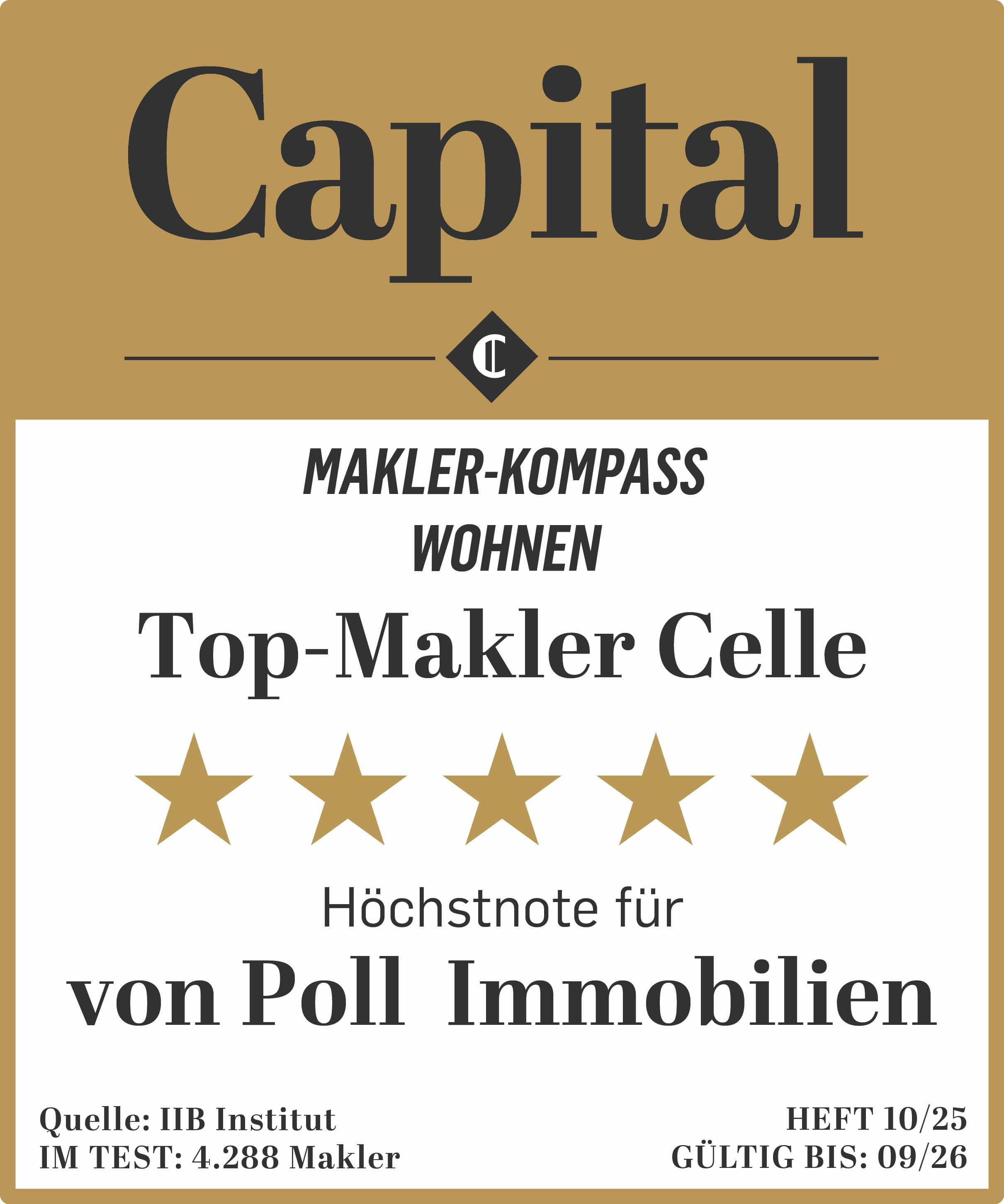 Das renommierte Wirtschaftsmagazin Capital hat unser Team von VON POLL IMMOBILIEN Celle erneut mit der Höchstnote ausgezeichnet.