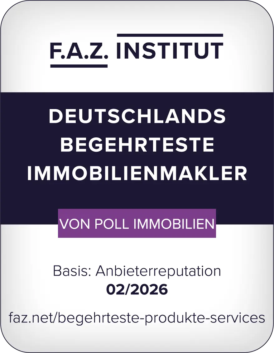 VON POLL IMMOBILIEN wird vom F.A.Z.-Institut bereits zum sechsten Mal in Folge mit dem Siegel „Deutschlands begehrteste Immobilienmakler“ ausgezeichnet und geht mit der Höchstzahl von 100 Punkten erneut als Branchensieger hervor. Untersucht wurden die Themenfelder Preis-Leistungs-Verhältnis, Kundenzufriedenheit, Qualität, Service, Weiterempfehlung sowie Begehrtheit.