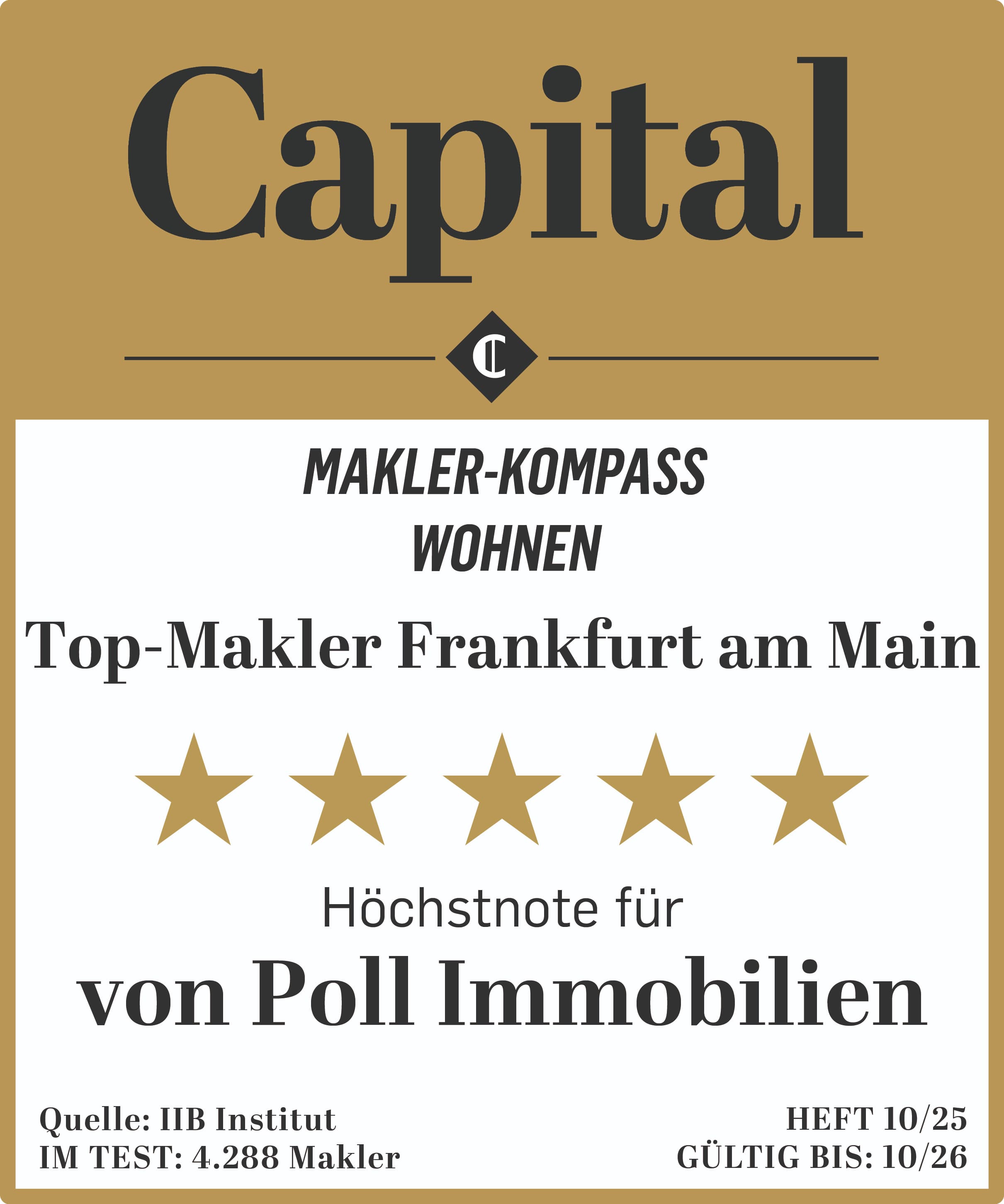 VON POLL IMMOBILIEN Frankfurt am Main wurde 2025 erneut von Bellevue zum Best Property Agent gekürt. Bereits seit 2006 prüft eine Expertenjury – bestehend aus Juristen, Journalisten und erfahrenen Immobilienprofis – die Expertise von Maklerunternehmen. Bewertet werden die Kriterien Seriosität und Professionalität, langjährige Erfahrung und fundiertes Fachwissen, objektive Beratung und tiefgehende Marktkenntnisse, attraktives Angebotsportfolio und ein umfassendes Dienstleistungsangebot sowie Zuverlässigkeit und kundenorientiertes Handeln.