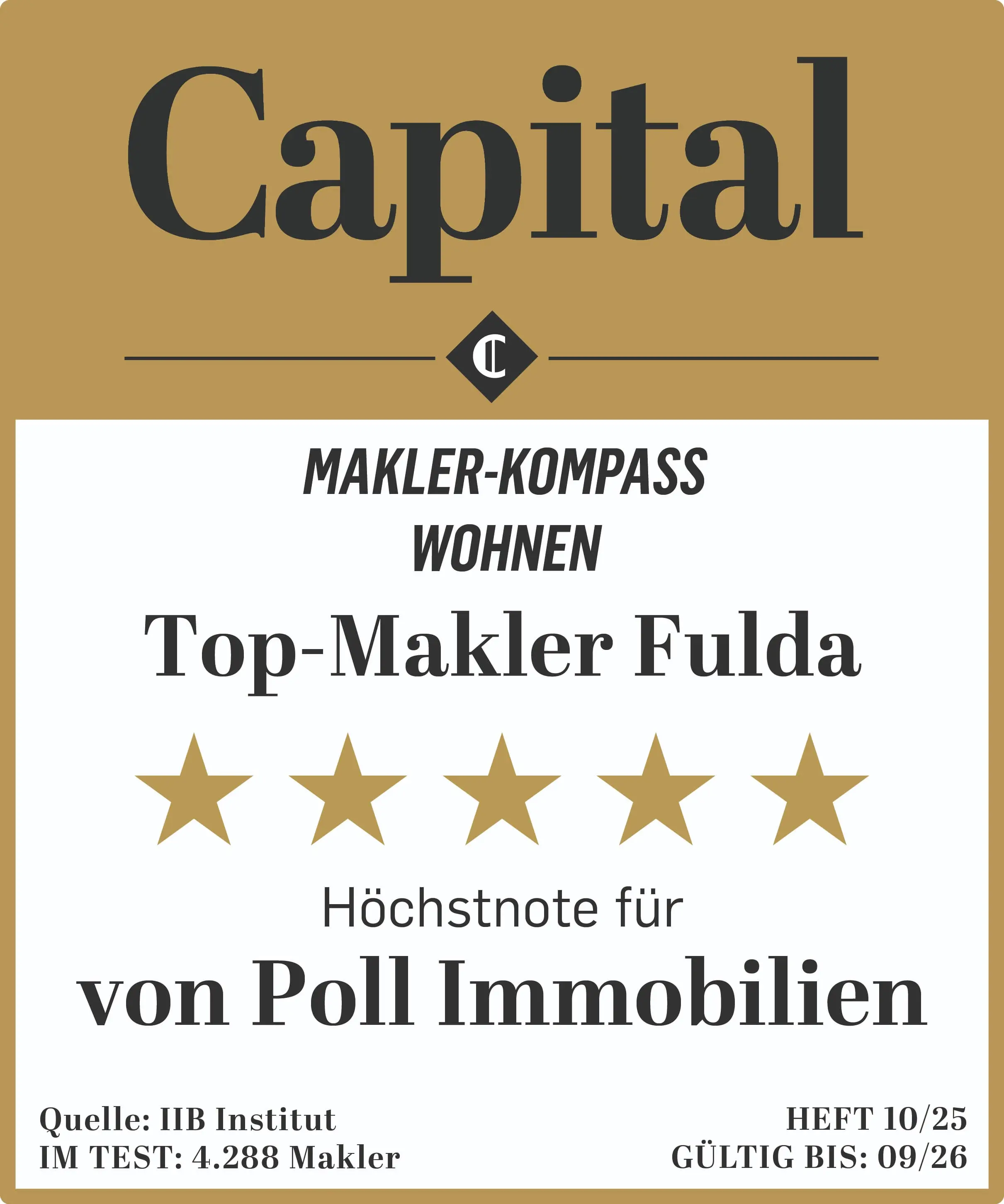 VON POLL IMMOBILIEN wurde beim Capital Makler-Kompass 2025 an insgesamt 164 Standorten im Segment der Wohnimmobilien und an zwei Standorten im Commercial-Bereich mit der Höchstnote von fünf Sternen ausgezeichnet. Mit diesem Ergebnis ist VON POLL IMMOBILIEN zum wiederholten Male das Immobilienmaklerunternehmen mit den meisten prämierten Standorten. Auch VON POLL IMMOBILIEN Fulda gehört zu den ausgezeichneten Standorten und somit zu den besten Maklern seiner Region.