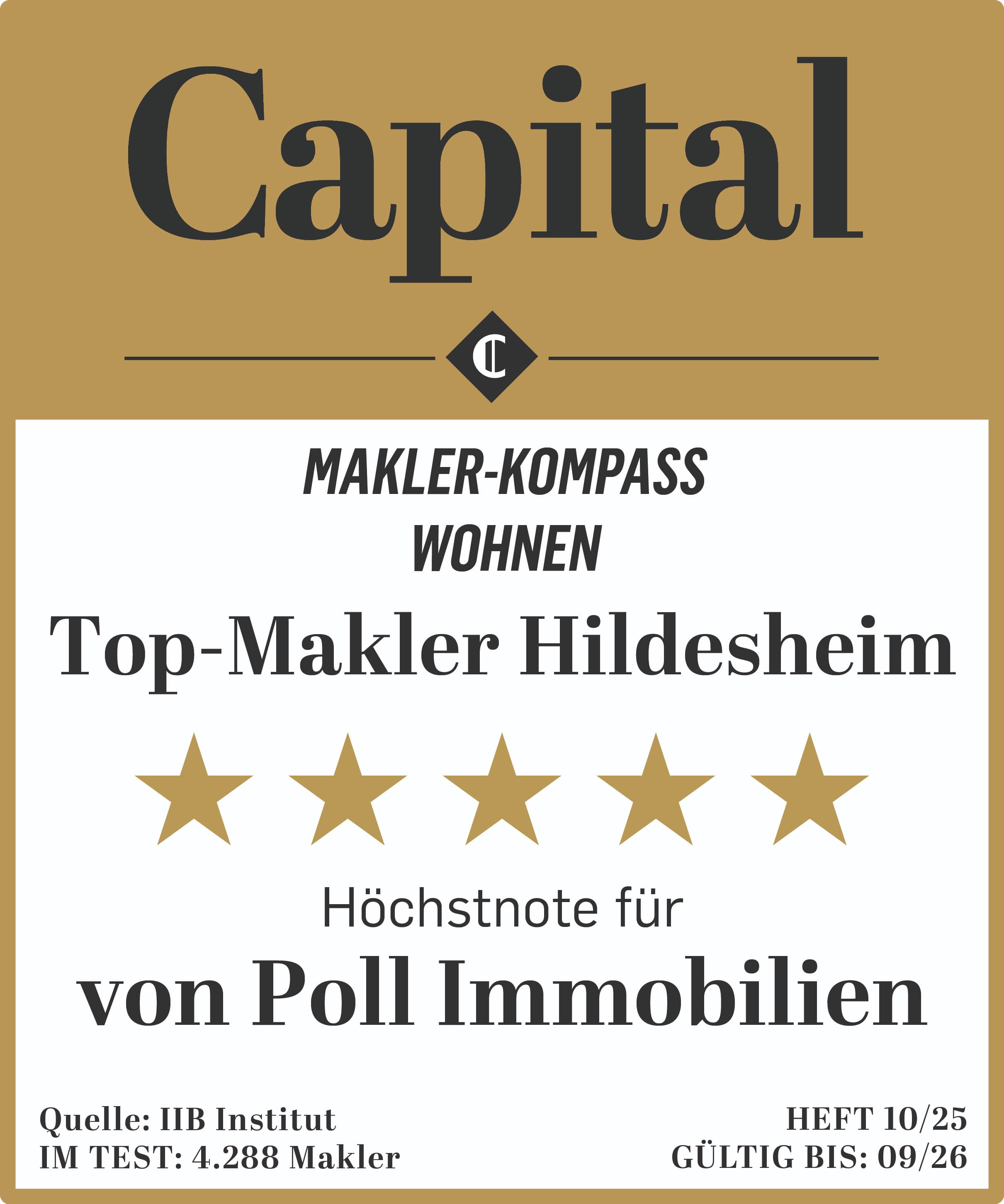VON POLL IMMOBILIEN wurde beim Capital Makler-Kompass 2025 an insgesamt 164 Standorten im Segment der Wohnimmobilien und an zwei Standorten im Commercial-Bereich mit der Höchstnote von fünf Sternen ausgezeichnet. Mit diesem Ergebnis ist VON POLL IMMOBILIEN zum wiederholten Male das Immobilienmaklerunternehmen mit den meisten prämierten Standorten. Auch VON POLL IMMOBILIEN Hildesheimgehört zu den ausgezeichneten Standorten und somit zu den besten Maklern seiner Region.
