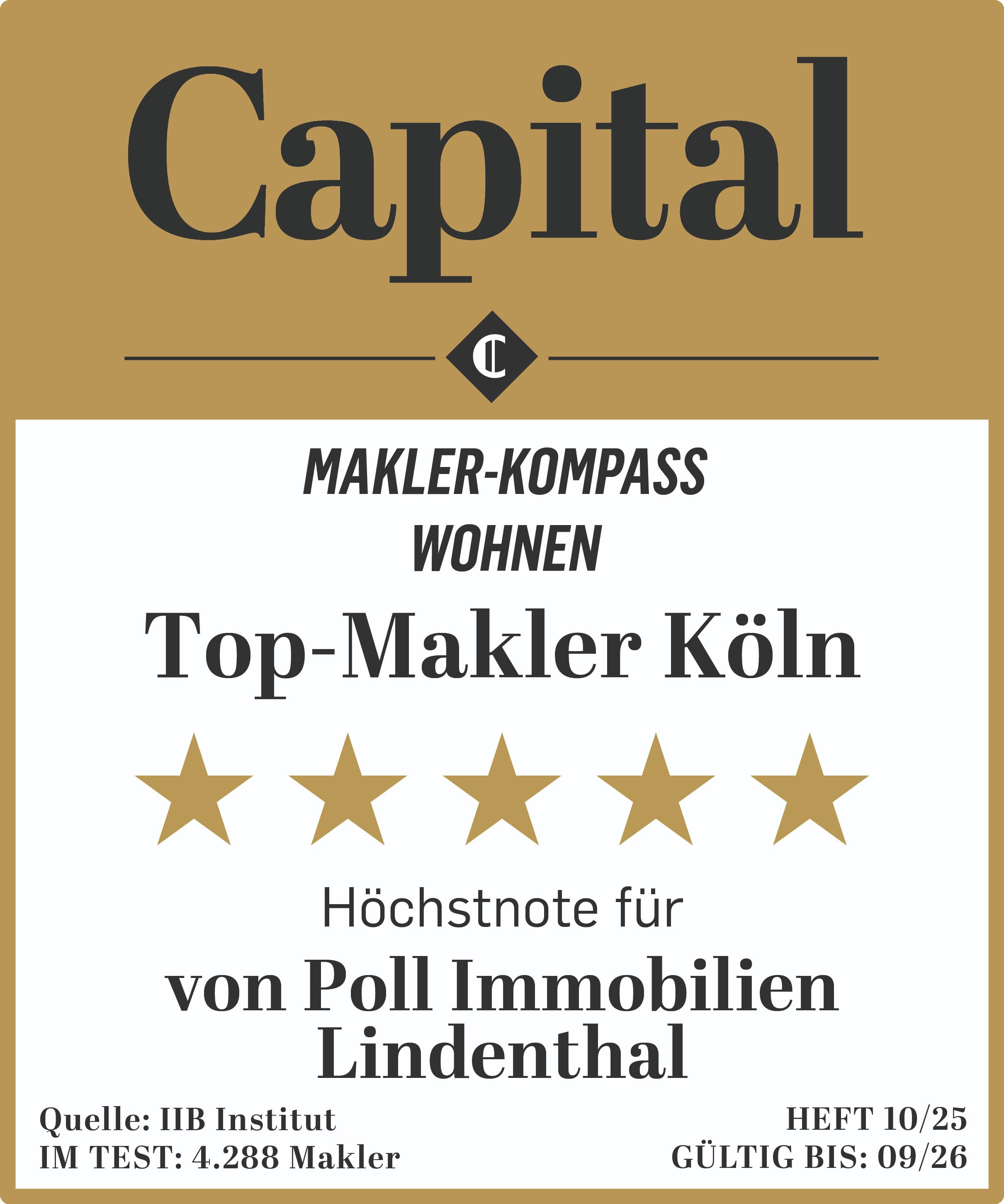 VON POLL IMMOBILIEN Köln Lindenthal wurde 2025 von Bellevue zum Best Property Agent gekürt. Bereits seit 2006 prüft eine Expertenjury – bestehend aus Juristen, Journalisten und erfahrenen Immobilienprofis – die Expertise von Maklerunternehmen. Bewertet werden dabei Kriterien wie Seriosität und Professionalität, langjährige Erfahrung und fundiertes Fachwissen, objektive Beratung und tiefgehende Marktkenntnisse, ein attraktives Angebotsportfolio und ein umfassendes Dienstleistungsangebot sowie Zuverlässigkeit und kundenorientiertes Handeln.