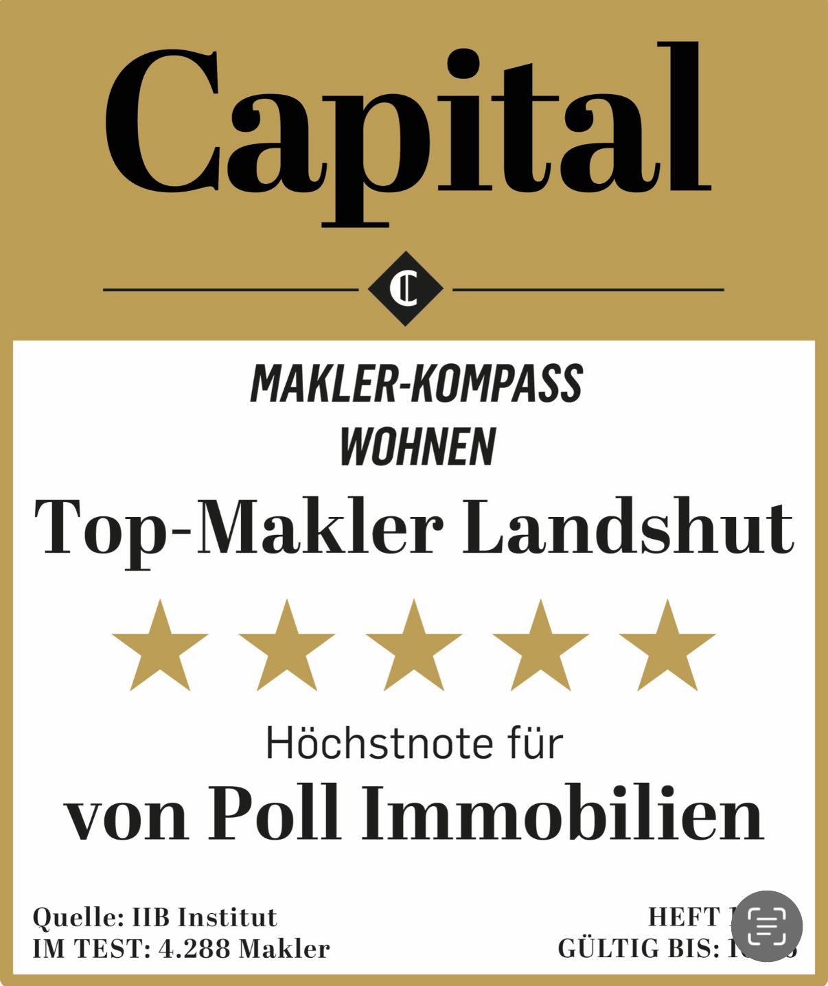 Wir freuen uns sehr, auch in diesem Jahr wieder zu den besten Immobilienmaklern Deutschlands zu zählen! Im renommierten Capital Makler-Kompass wurde unser Büro in Landshut mit der Höchstnote von fünf Sternenausgezeichnet – als Top-Makler in Landshut.