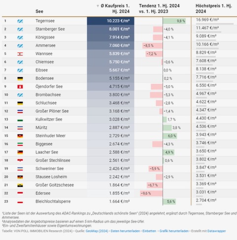 ● Immobilien um den Tegernsee in Bayern verzeichnen im ersten Halbjahr 2024 mit durchschnittlich 10.223 Euro die teuersten Quadratmeterpreise sowie die höchste Preissteigerung mit 9,8 Prozent gegenübe...