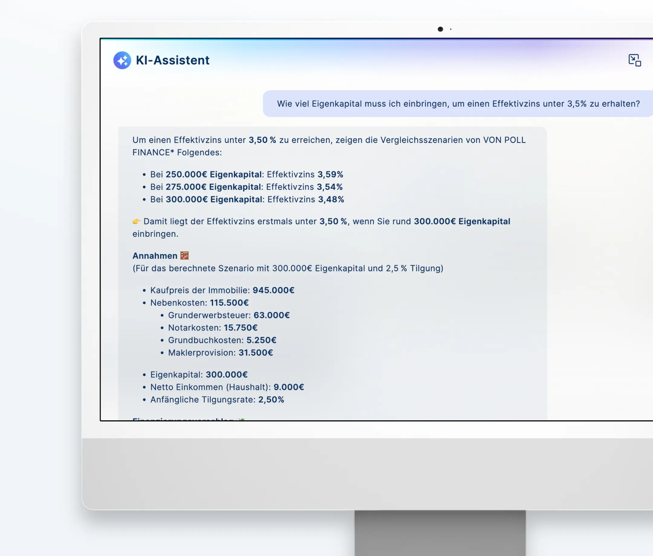 Schreiben Sie „Ich benötige eine Finanzierung für diese Immobilie“, wenn Sie sich gerade auf der Seite eines Exposés befinden. Der Assistent erkennt das Objekt und bezieht automatisch die Finanzierungsrechnung darauf.