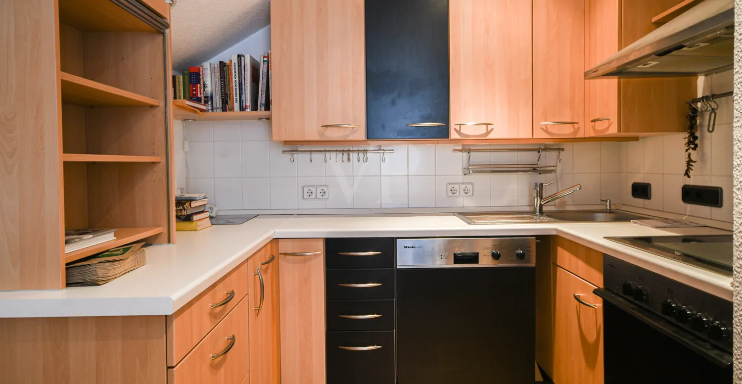 Die separate Küche ist mit einer Einbauküche ausgestattet und verfügt über einen Kamin. Weitere Möbel können auf Wunsch gerne übernommen werden. Das Schlafzimmer ist kompakt, bietet aber mit seiner integrierten Klimaanlage einen besonderen Komfortfaktor. Ein angrenzender kleiner Abstellraum ergänzt die praktische Nutzung. Das Gästezimmer ist aktuell offen gestaltet und ohne Tür, wodurch sich vielseitige Möglichkeiten ergeben. Der ehemalige Treppenhausaufgang wurde clever geschlossen und in einen Ankleideraum umfunktioniert. Das Badezimmer ist funktional mit einer Dusche ausgestattet.
