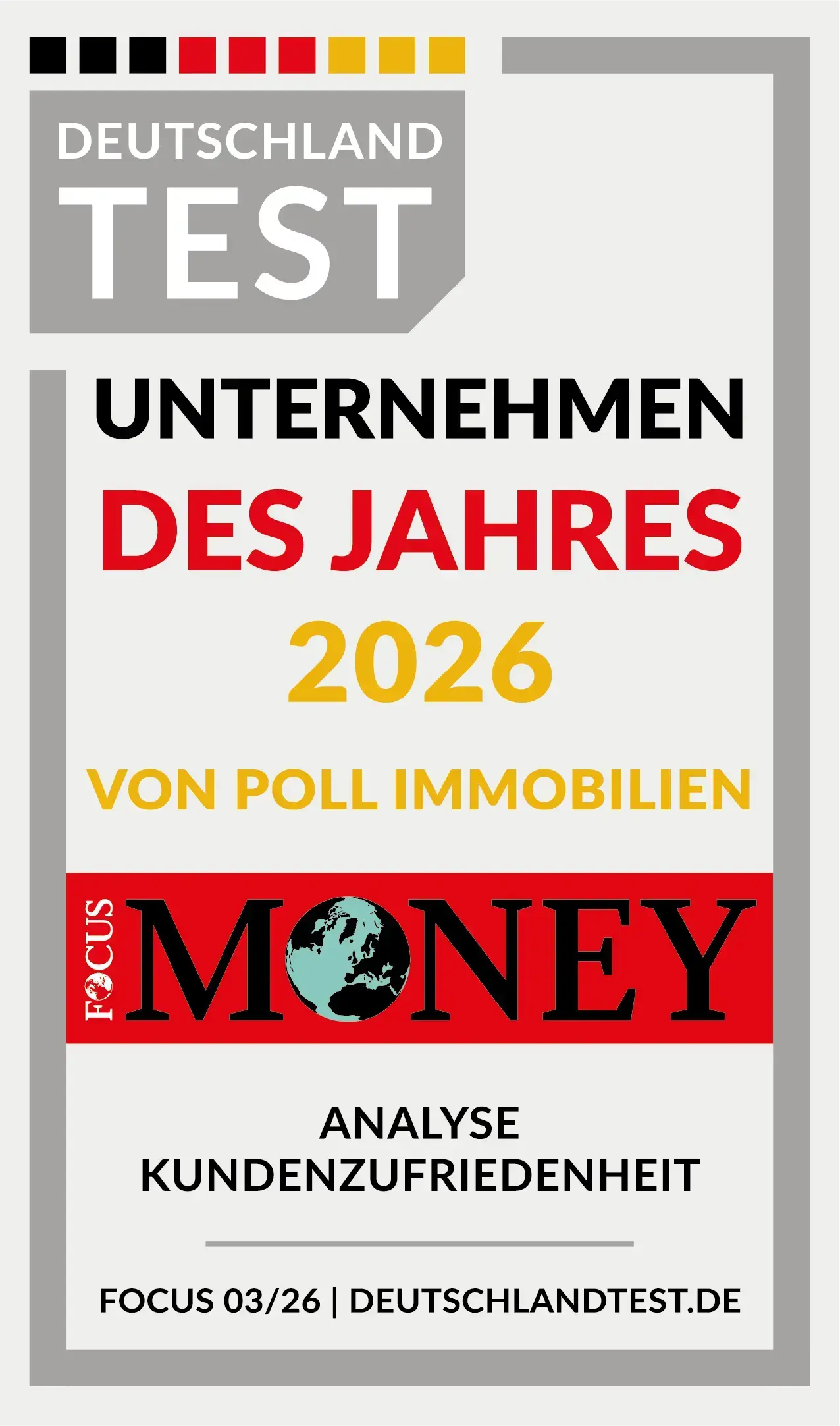 VON POLL IMMOBILIEN is named Company of the Year 2025 by the business magazine Focus Money and achieves the highest score of 100 points in the "Real Estate Agent" sector. On behalf of Deutschland Test, the Cologne-based analysis company ServiceValue evaluated several million mentions of around 13,000 companies. The areas of price-performance, customer trust, popularity and social responsibility were analyzed.