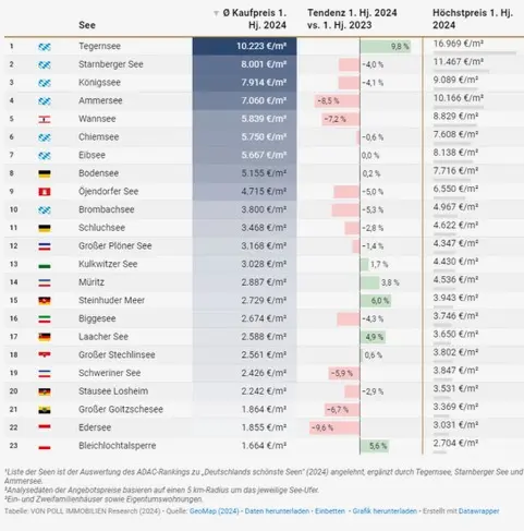 ● Properties around Lake Tegernsee in Bavaria recorded the most expensive prices per square meter in the first half of 2024 at an average of 10.223 and the highest price increase of 9.8 percent compar...
