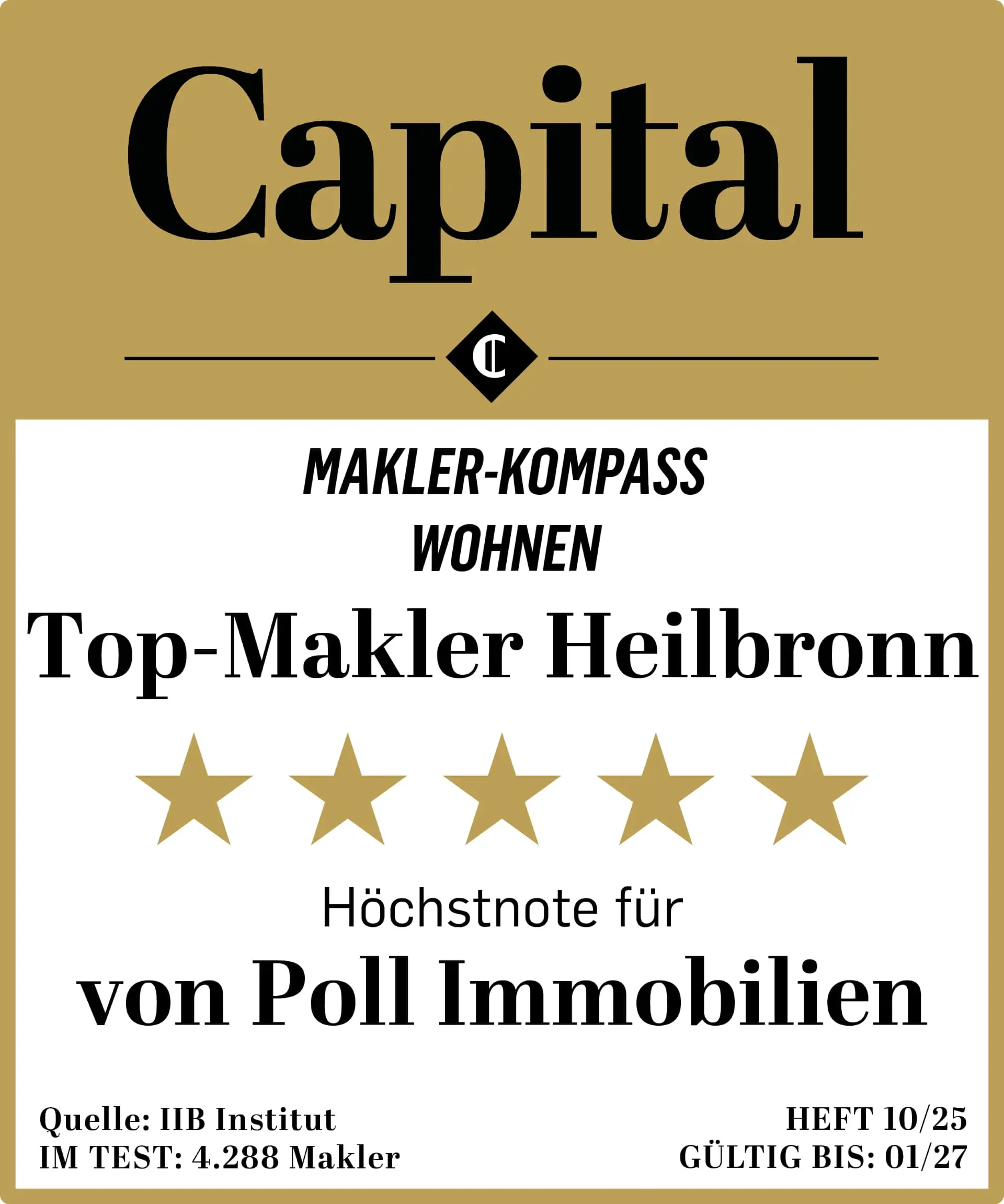 VON POLL IMMOBILIEN a été élue entreprise de l'année 2025 par le magazine économique Focus Money et a obtenu le score maximal de 100 points dans la branche "agents immobiliers". À la demande de Deutschland Test, le bureau d'analyse ServiceValue de Cologne a évalué plusieurs millions de mentions concernant environ 13 000 entreprises. Les domaines analysés sont le rapport qualité-prix, la confiance des clients, la popularité et la responsabilité sociale.