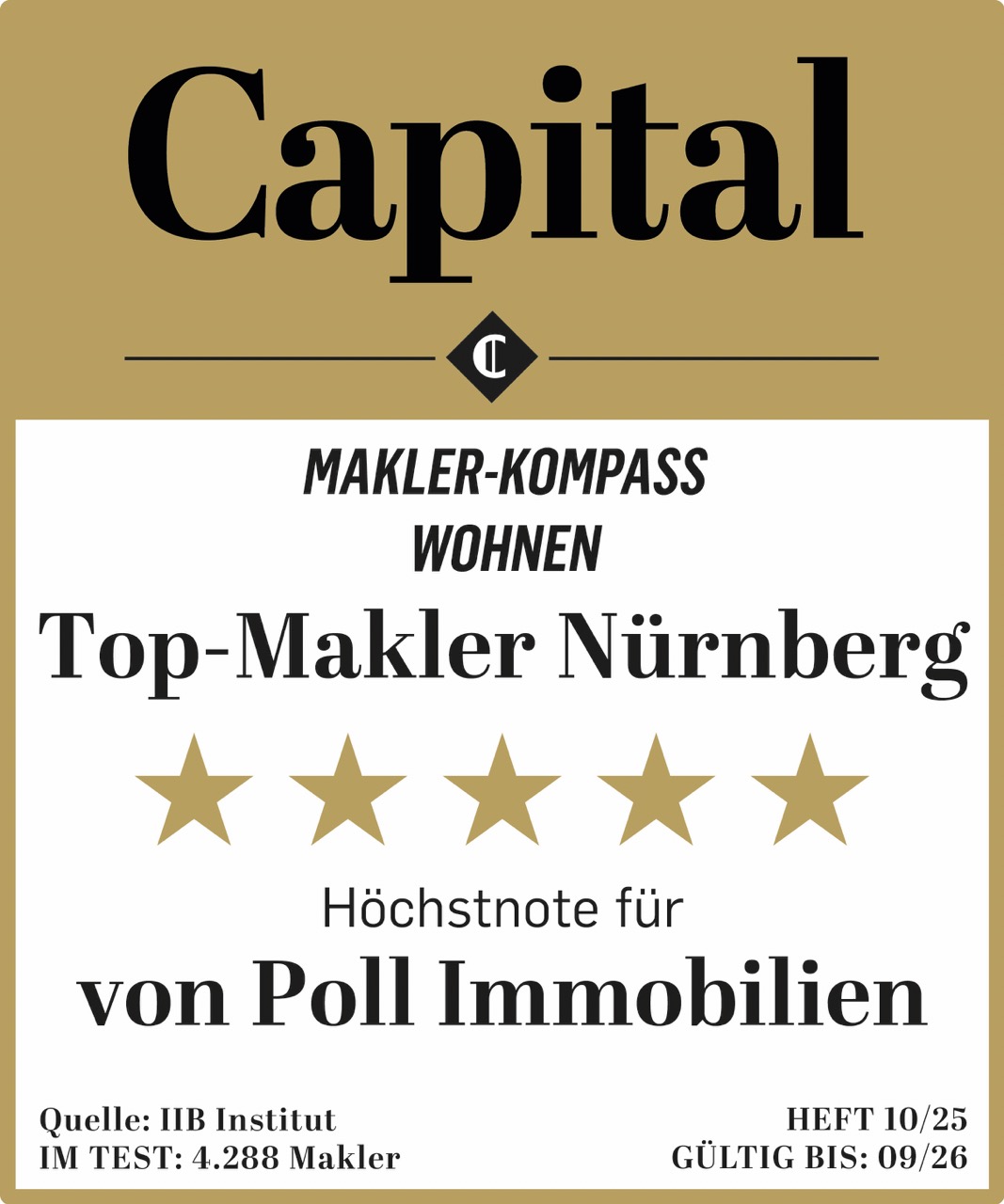 VON POLL IMMOBILIEN a de nouveau été distingué par le Capital Makler-Kompass 2025 en tant que agent immobilier 5 étoiles - cette fois-ci dans aujourd'hui plus de 180 sites à travers l'Allemagne. VON POLL renforce ainsi sa position de leader parmi les prestataires de services immobiliers. VON POLL IMMOBILIEN Nürnberg fait à nouveau partie des sites primés et compte parmi les meilleurs agents immobiliers de la région. En coopération avec l'institut ibb Institut, plus de 15.000 agences immobilières ont été analysées et évaluées - entre autres dans 161 villes allemandes. Les participants ont été évalués selon des critères très stricts : Qualification, Qualité du processus, Exposé & Contrat ainsi que Service Client. Grâce à des normes élevées, des processus novateurs et des conseils de premier ordre, VON POLL IMMOBILIEN a de nouveau su convaincre.