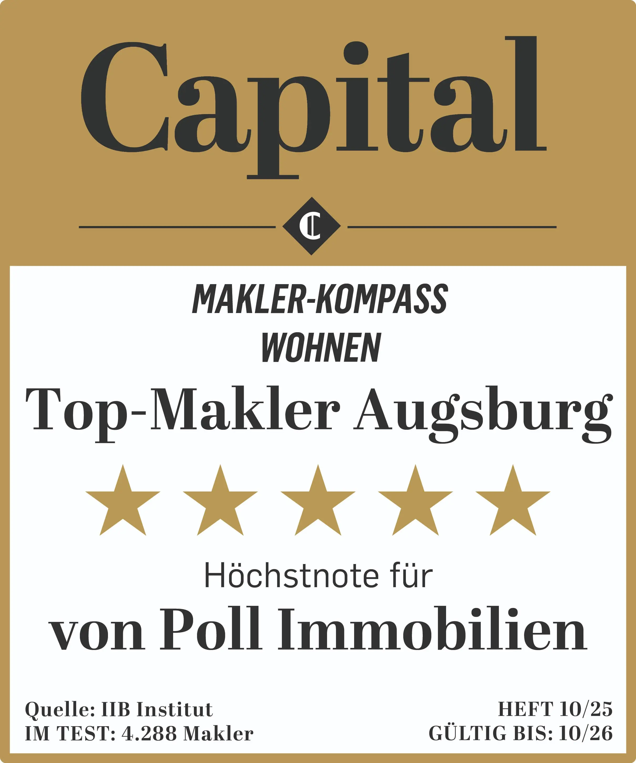 A VON POLL IMMOBILIEN elnyerte az F.A.Z. Intézet "Németország legkeresettebb ingatlanközvetítői 2025" pecsétjét, és a legmagasabb, 100 pontos pontszámmal ismét az iparág győztese lett. Az ingatlanügynökség sorozatban ötödik alkalommal kapta meg a díjat. Az elemzett kategóriák a következők voltak: ár-érték arány, ügyfélelégedettség, minőség, szolgáltatás, ajánlás és kívánatosság.