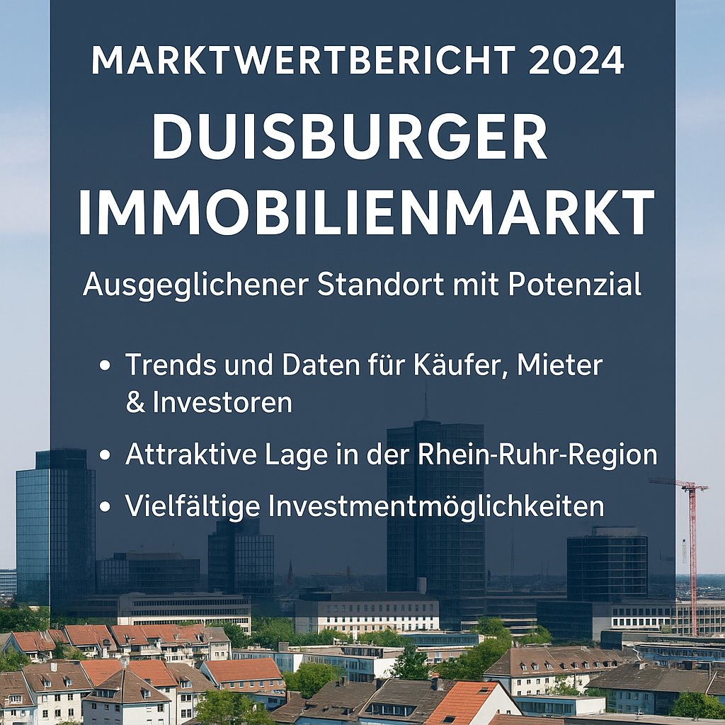 Em 2024, o mercado imobiliário de Duisburg apresenta-se como um local equilibrado e versátil, com oportunidades atractivas para compradores, inquilinos e investidores. Graças à sua localização conveniente no coração da região do Reno-Ruhr, aos preços acessíveis e à crescente procura de imóveis residenciais e comerciais, Duisburgo continua a ser um mercado interessante e com potencial. Neste Market Value Report 2024, analisamos as tendências actuais dos preços, as principais áreas de procura e as oportunidades de investimento - com base no relatório oficial do mercado imobiliário da Duisburg Business & Innovation GmbH. Quer se trate de imóveis residenciais em locais familiares, de espaços de escritórios modernos ou de áreas logísticas no porto: Duisburg oferece uma vasta gama de perspectivas para investimentos sustentáveis. Leia abaixo as tendências e os dados mais importantes para o ajudar a tomar decisões informadas para o seu projeto imobiliário. (Fonte: Duisburg Business & Innovation GmbH, relatório do mercado imobiliário 2024)